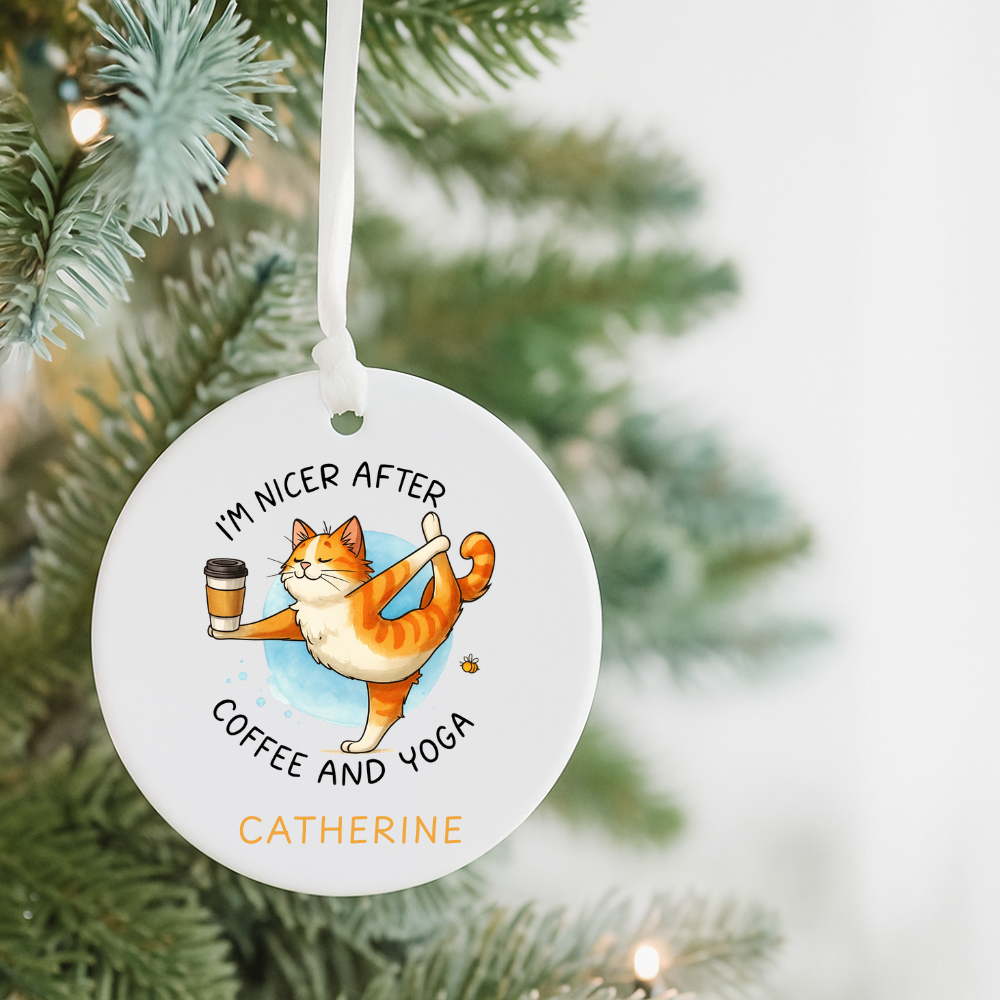 Personalized Ceramic Ornament – "I’m Nicer After Coffee and Yoga" Cat Design